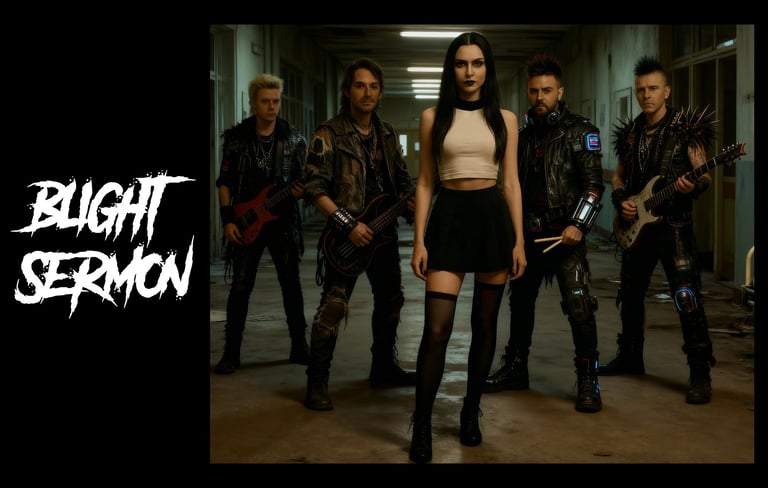 Fronted by Lilith Vale, the band’s singular female voice, Blight Sermon fuse doom-laden riffs, industrial abrasion, and gothic sensuality into a sound that feels less like a performance and more like a ritual. Lilith’s contralto—intimate, commanding, and venomous—delivers lyrics that dismantle devotion, expose hypocrisy, and reclaim power from the ashes of belief.